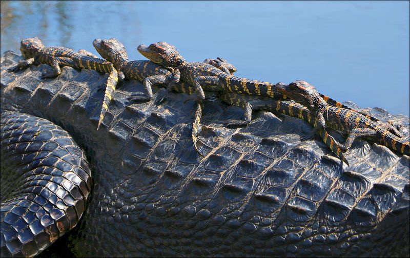 Young alligators stay with their mothers in family groups called “pods,” learning hunting techniques and territory defense – upending the stereotype of reptiles as cold, unfeeling parents.
