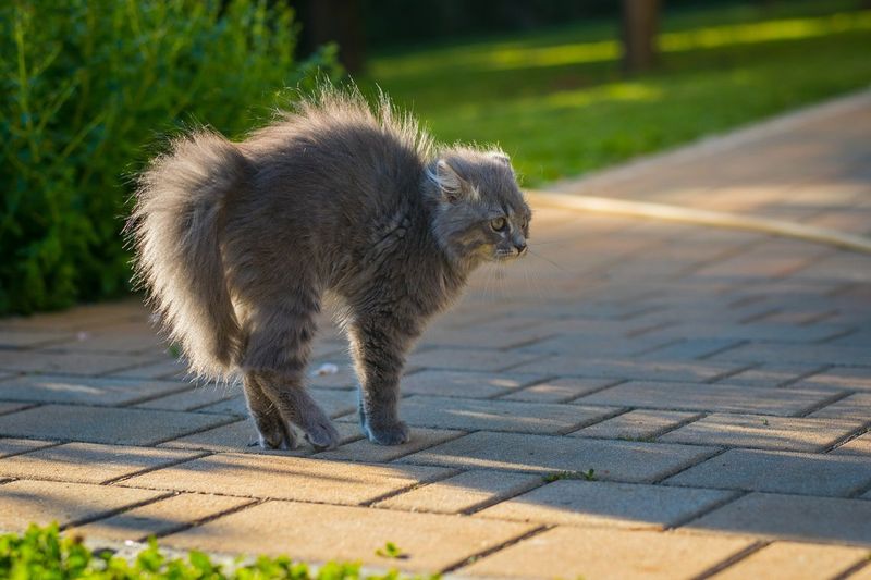 That bottle-brush tail isn’t a fashion statement! When cats puff up, they’re trying to appear larger to intimidate potential threats.