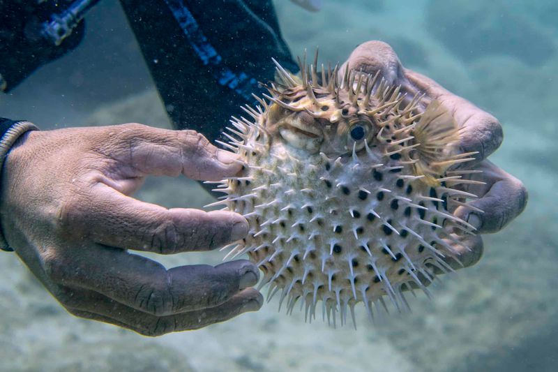 When startled, these bizarre fish transform from swimming potatoes into floating spike balls! Their remarkable defense mechanism allows them to gulp water (or air if caught) to inflate to several times their normal size, while simultaneously extending dozens of sharp spines that were lying flat against their bodies.