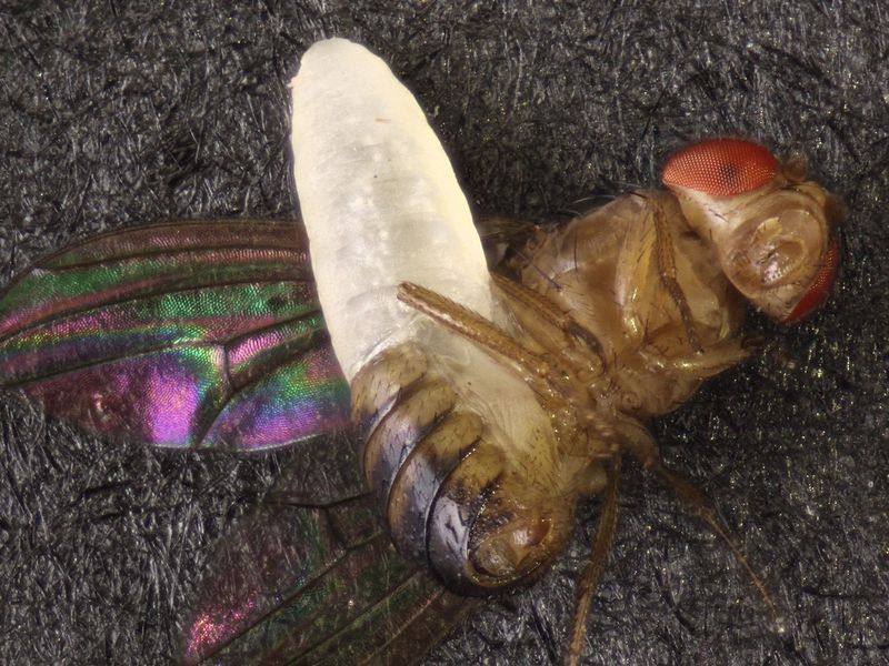 As development progresses, the larvae grow larger, eventually consuming critical organs. After pupation inside the host’s empty shell, adult wasps emerge by cutting through the fly’s exoskeleton.