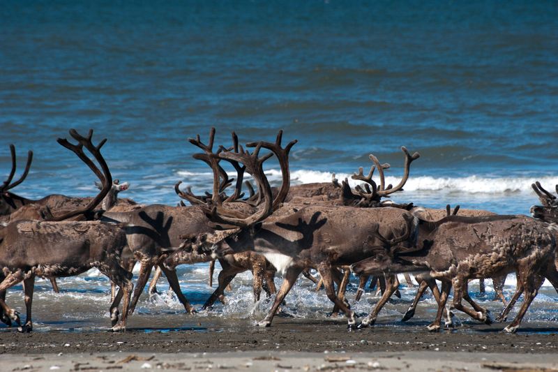 When rivers or lakes block their path, caribou don’t hesitate. They plunge into frigid waters, swimming powerfully with broad hooves acting as paddles.